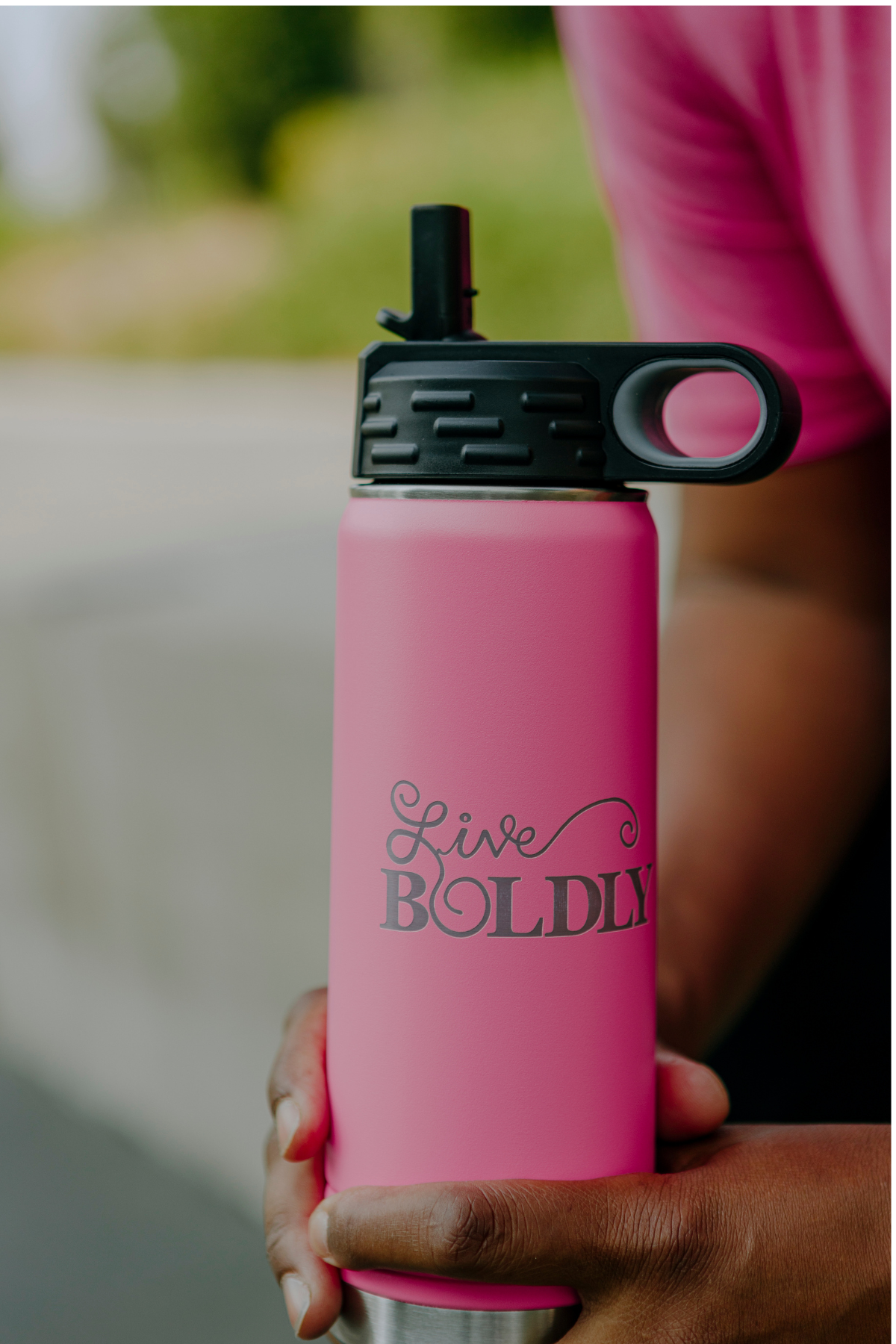 Pink 20 ounce stainless steel water bottle with flip top lid and straw